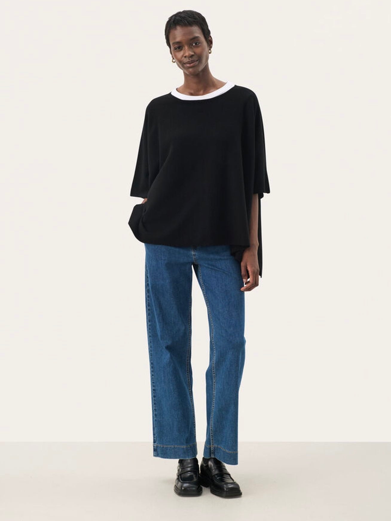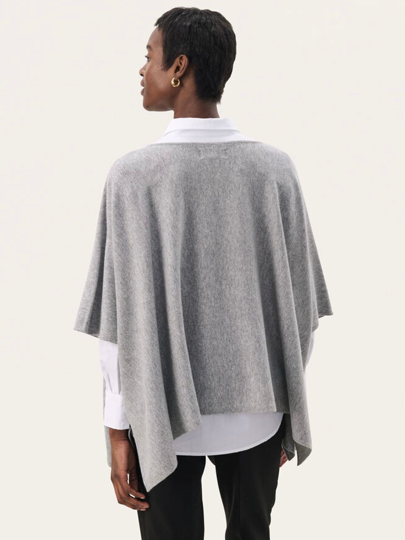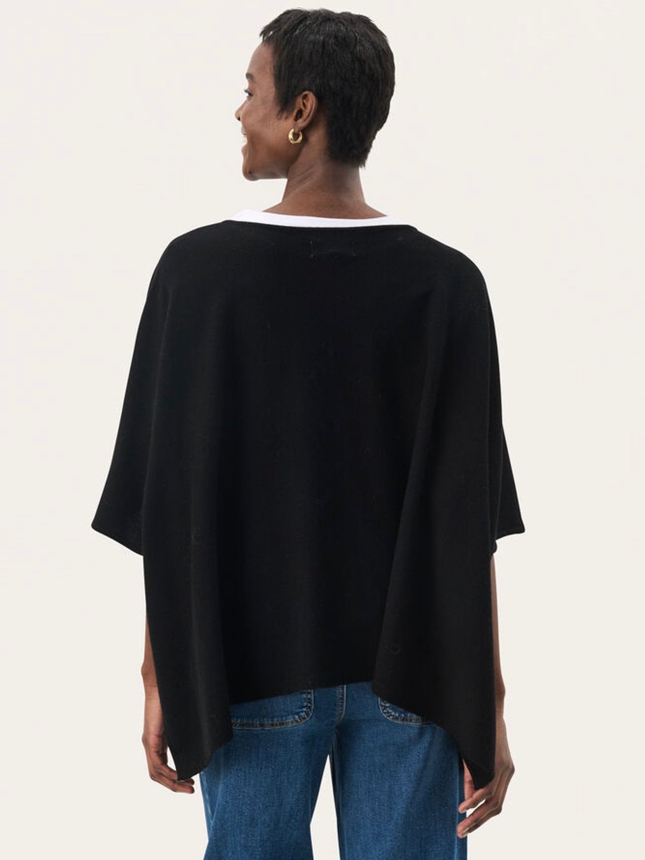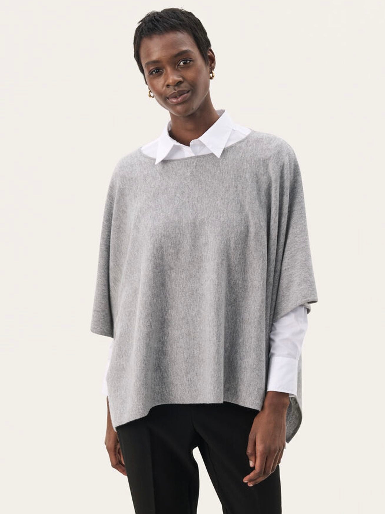 Modisch leger und kastig geschnittener Ponchopullover mit rundem Ausschnitt. Abgerundeter Saum, vorn kürzer gearbeitet. Die Seiten ergeben eine halbe Ärmellänge. Angenehm weiche Qualität für jede Jahreszeit.