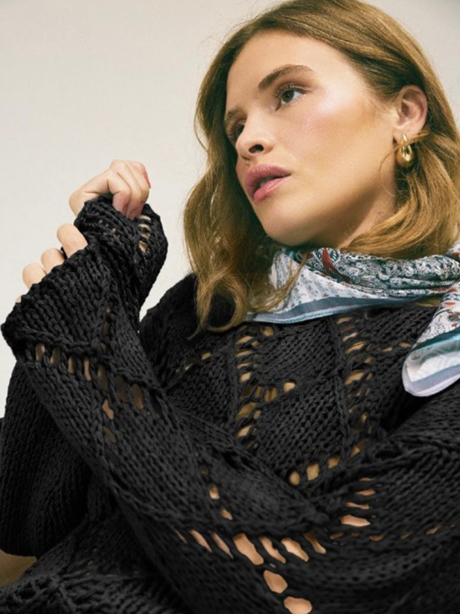 Modisch kurz geschnittener Lochstrickpullover mit weitem Rundhalsausschnitt und überschnittenen langen Ärmeln. Aufwändiges Rautenstrickmuster, modisch über Shirts zu tragen. Gerader Saum ohne Bund.
