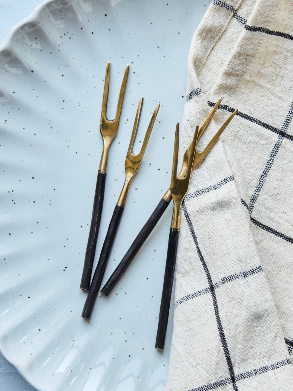 Die organische Form jeder Gabel ist Ausdruck außergewöhnlich einzigartigen Designs. Die Kombination aus Antikmessing und schwarzem Griff spiegelt moderne Lässigkeit und klassische Schönheit zugleich wider. Die Gabel ist vielseitig einsetzbar – ob beim Dinner mit Freunden, für Vorspeisen oder als stilvolles Detail zu deinen Snacks. Für Genussmomente, die deine Liebe zum Detail unterstreichen – bei jedem Anlass.
