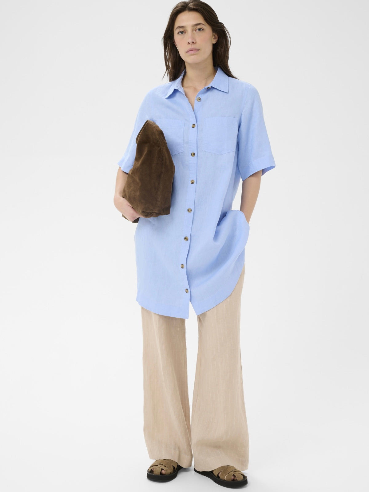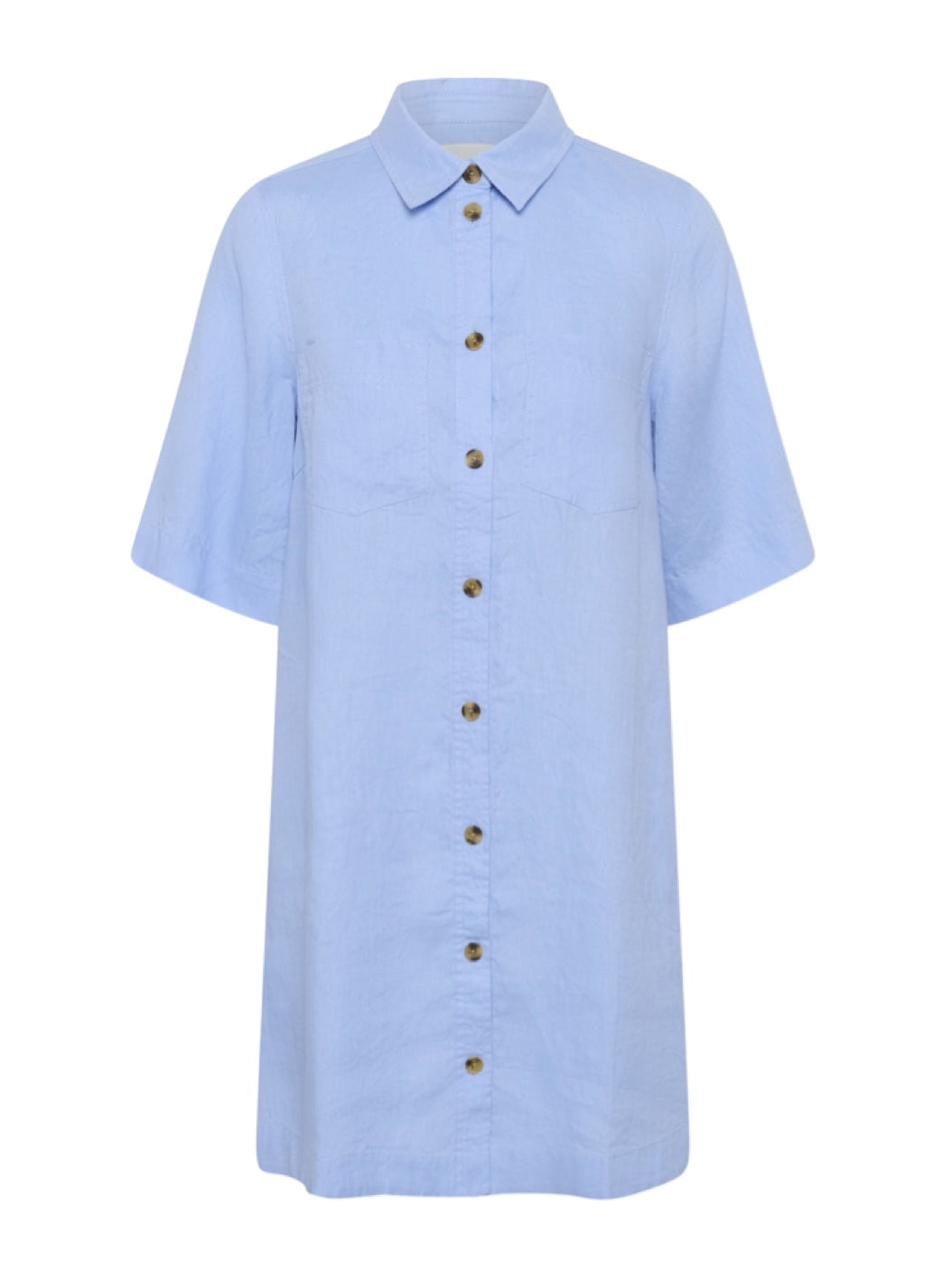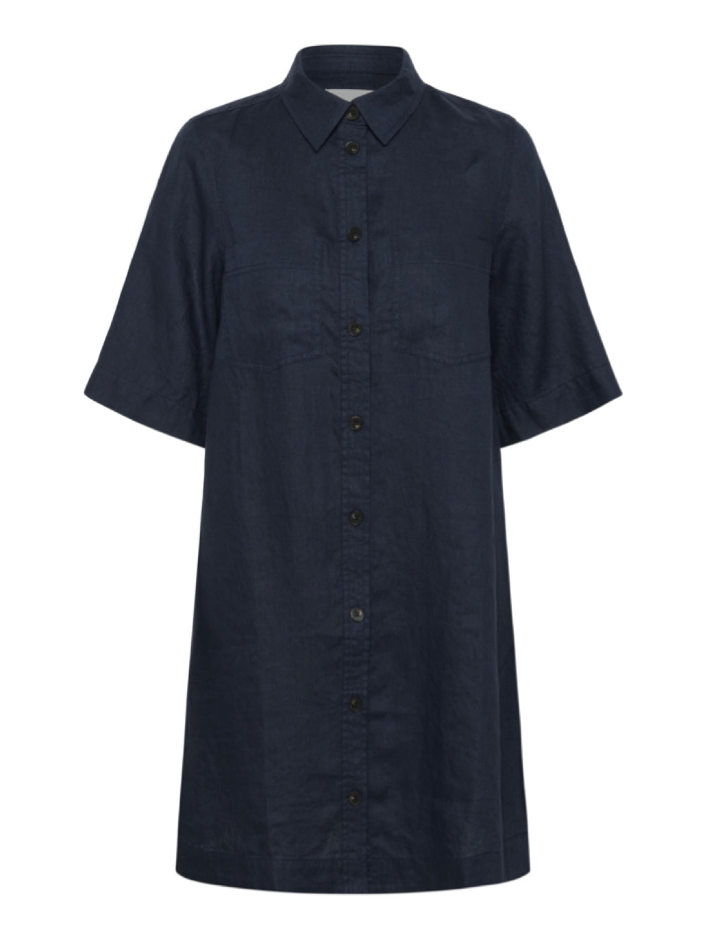 Schlichtes Hemdblusenkleid in gerader Form mit halblangen Ärmeln.