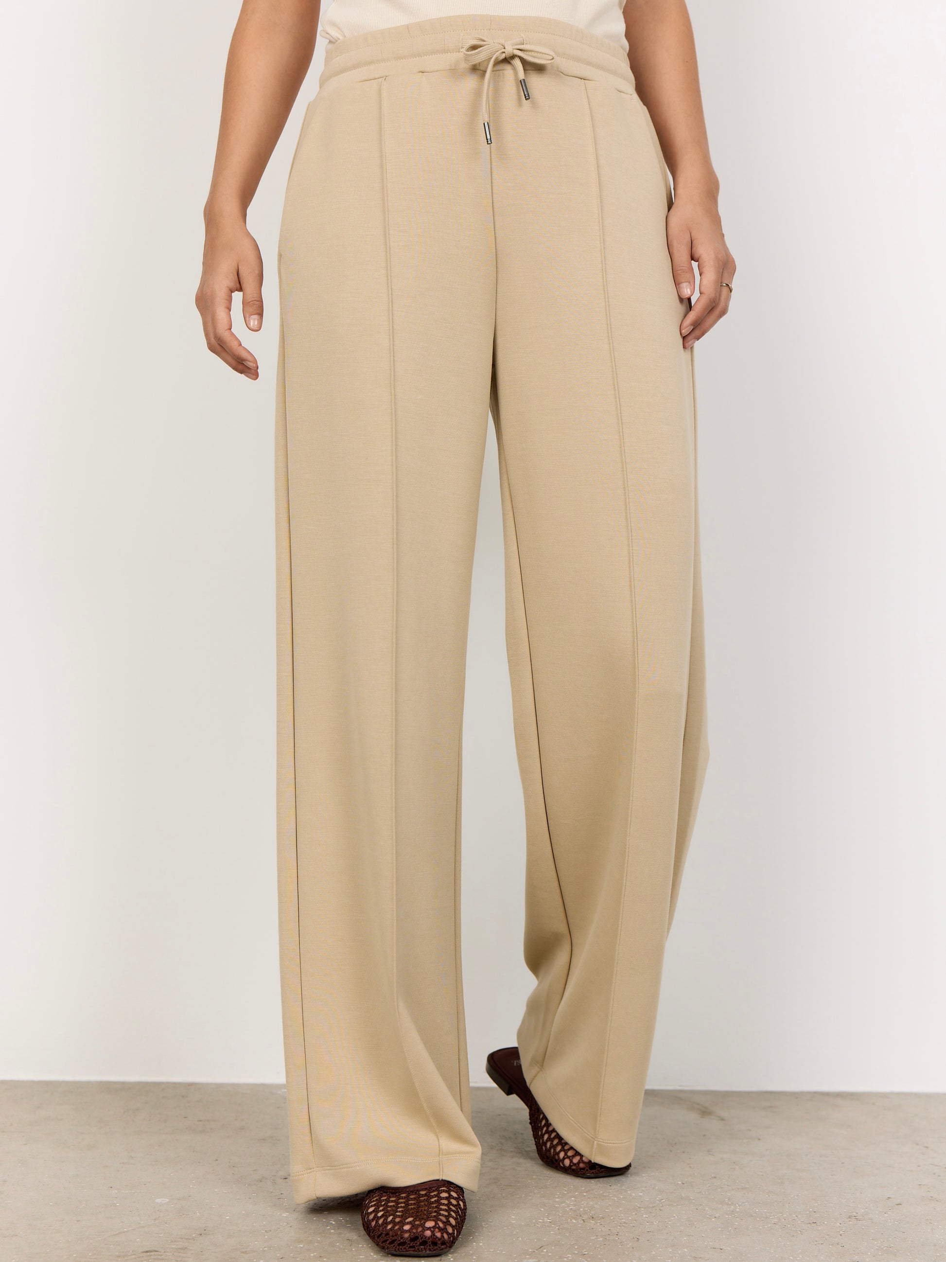 Lässig weite Sweathose mit eingearbeiteter Bügelfalte. Angenehme Modalmischung. Seitliche Eingrifftaschen und angesetztes Bündchen mit Gummizug und Bindeband vorn. Sowohl in der Freizeit als auch ins Büro zu tragen.