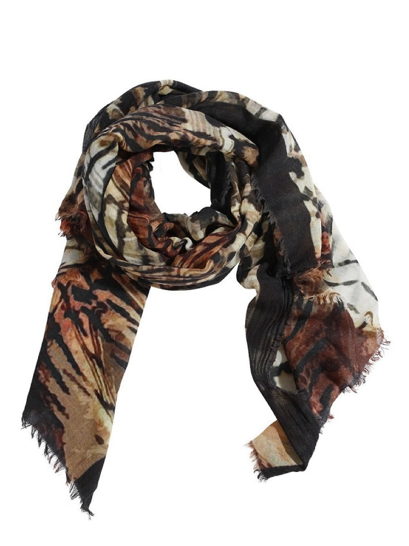 Edler Modeschal mit einem dezenten Tiermuster aus einer hochwertigen Wollqualität. Besonders softes und leichtes Strickgewebe mit kurzen Fransen am Abschluss. Er lässt sich ideal kombinieren.